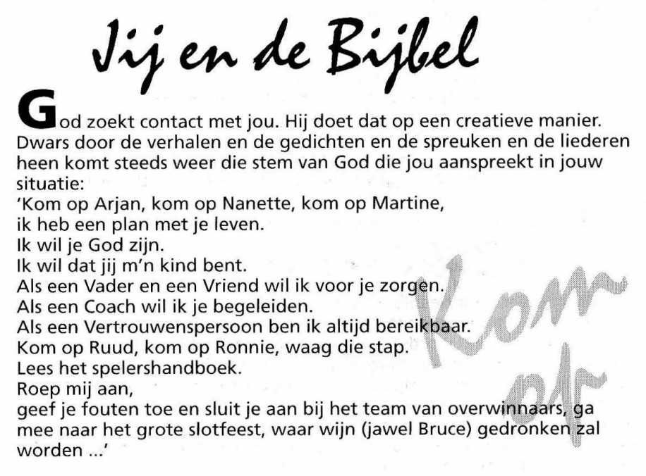 Dwars door de verhalen en de gedichten en de spreuken en de liederen heen komt steeds weer die stem van God die jou aanspreekt in jouw situatie: