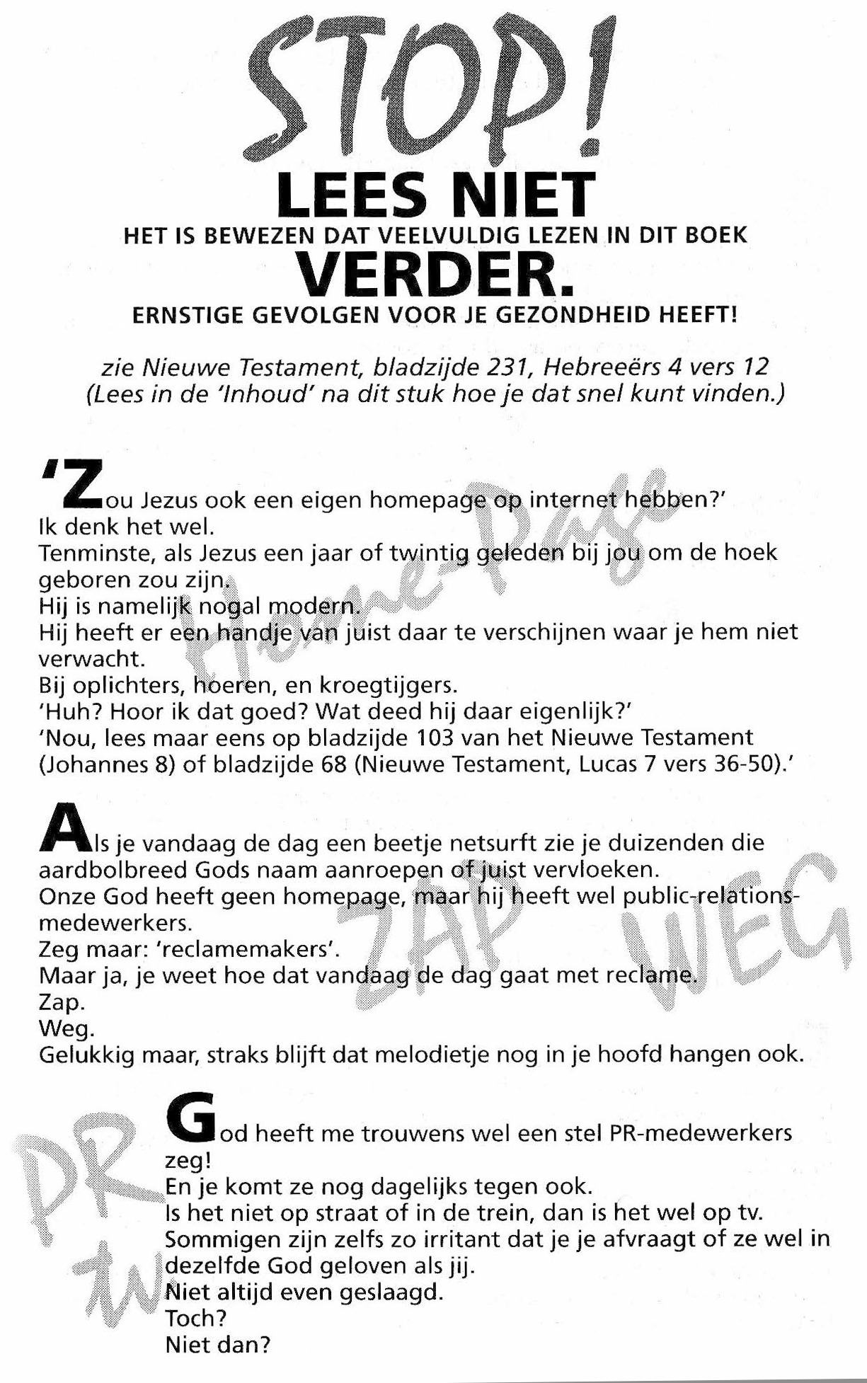 Verrassend vaak lijken de mensen die dit niet doorhebben te behoren tot de vervaardigers van religieuze jongerenlectuur. Ik citeer hier enkele hooglichten uit de inleiding tot de Groot Nieuws Bijbel van het NBG, 9e herziene druk, 2001: