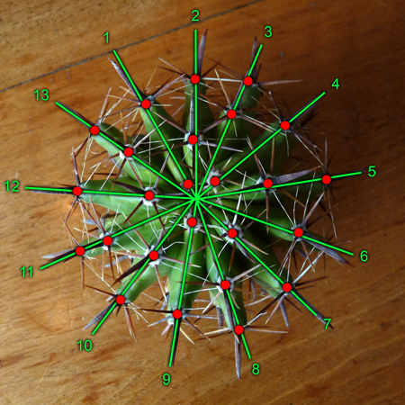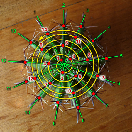 Ga in het centrum van de ribben staan en zoek de stekel die er het dichtst bij ligt. Zoek dan de op-één-na dichtstbijzijnde stekel, gevolgd door de op-twee-na-dichtstbijzijnde, etcetera. Al gauw zult u merken dat u een uitwaartse spiraal linksom volgt, telkens een verder van het centrum verwijderde stekel passerend. Hieronder zijn de eerste veertien stekels aangegeven, maar u kunt het proces voor de hele cactus voortzetten: