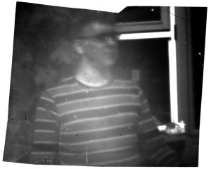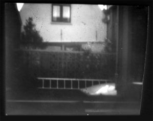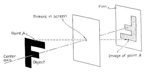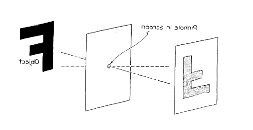 Overzichtelijk, toch? Lichtstralen gaan door het gaatje, boven wordt beneden, links wordt rechts, rechtopstaande F wordt 180° gedraaide F. Gedraaid, niet gespiegeld. En dus hoeft Drabkikker ook niks te ontspiegelen bij het inscannen.