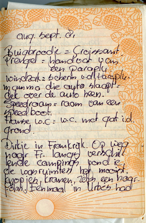 augustus-september 1981: Buigbroodje = croissant; prengel = handvat van een paraplu; windzak = scherm van de paraplu; mamma die auto slaapt = dek over de auto heen; speedraam = raam van een speedboot; franse w.c. = w.c. met gat i.d. grond.