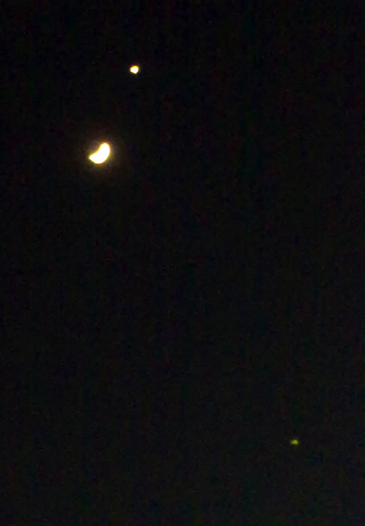 Uiteraard staat het internet allang vol met wèl gelukte foto’s, maar het feit dat zelfs mijn flutmobiel temidden van de Leidse lichtvervuiling toch nog dit soort resultaten geeft zegt wel iets over hoe fakking fel de Maan, Venus en Jupiter (vlnr) momenteel staan te conjugeren. Elke avond te bewonderen tot een uur of negen, gaat dat zien!