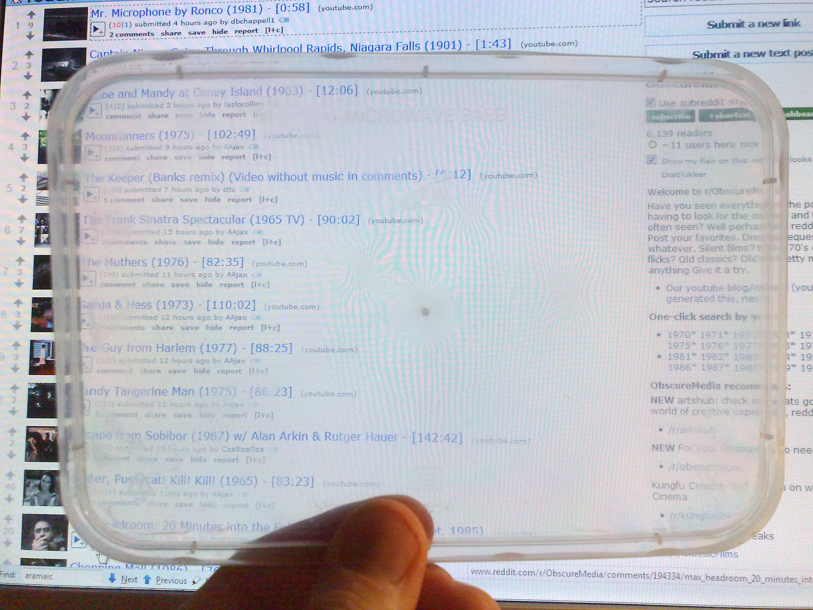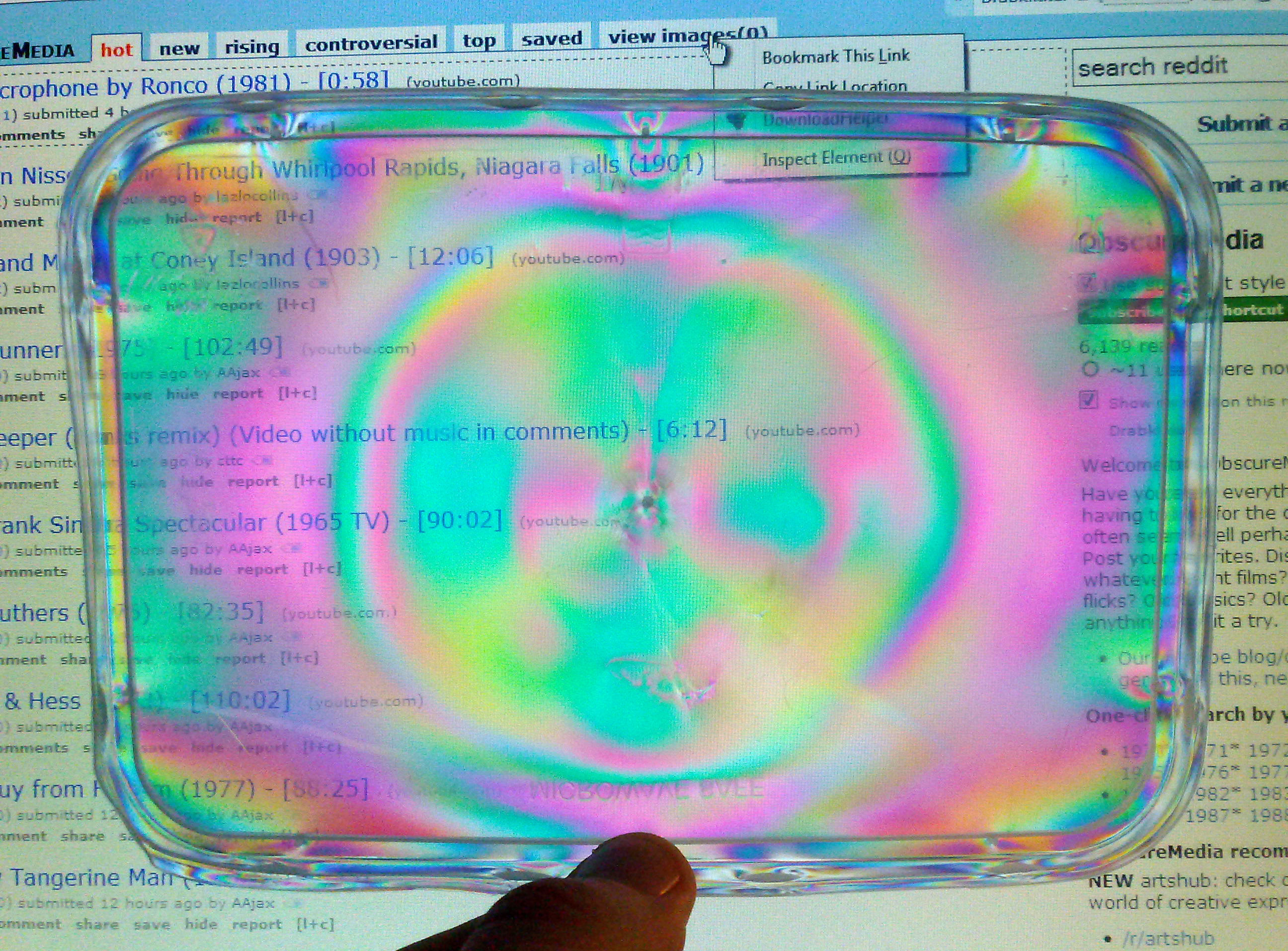 Wat je krijgt als je a) een monitor, b) een polarisatiefilter (in casu een 3D-filmbril) en c) een magnetronopwarmbakjedeksel in één lijn houdt.