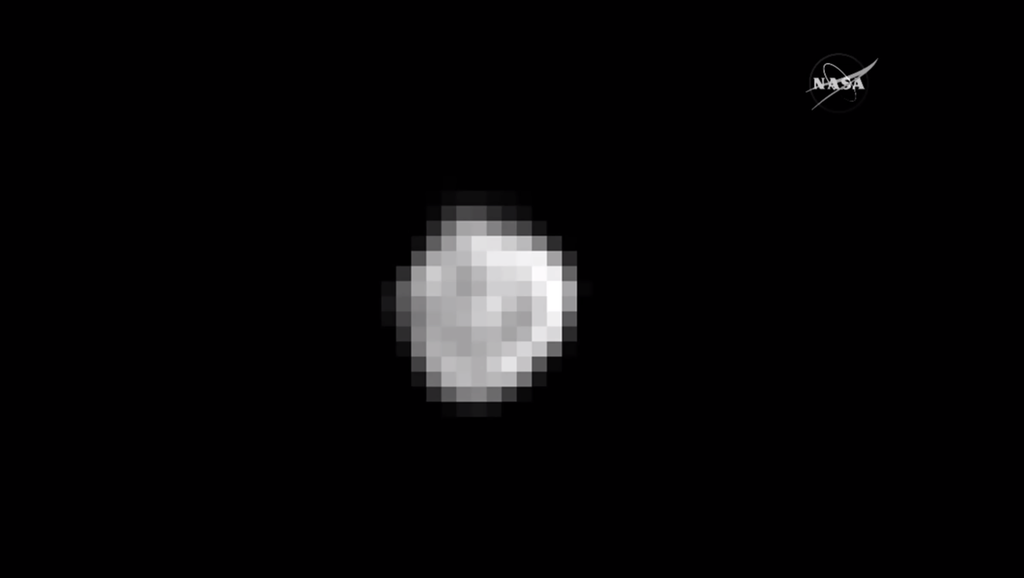 (En da’s notabene nog maar een composiet van gisteren. De (nòg) betere plaatjes komen waarschijnlijk morgen pas, want ook al heeft de flyby inmiddels plaatsgevonden, het duurt zoals vermeld even voordat de data ook daadwerkelijk hier is. Vergeet niet dat Pluto ongeveer vijfeneenhalf lichtuur van ons verwijderd is, en dan moet het downloaden dus nog beginnen. Wees blij dat zo’n scheepje niet eerst weer negen jaar terug moet vliegen en vervolgens blijkt dat het dopje nog op de lens zat.)