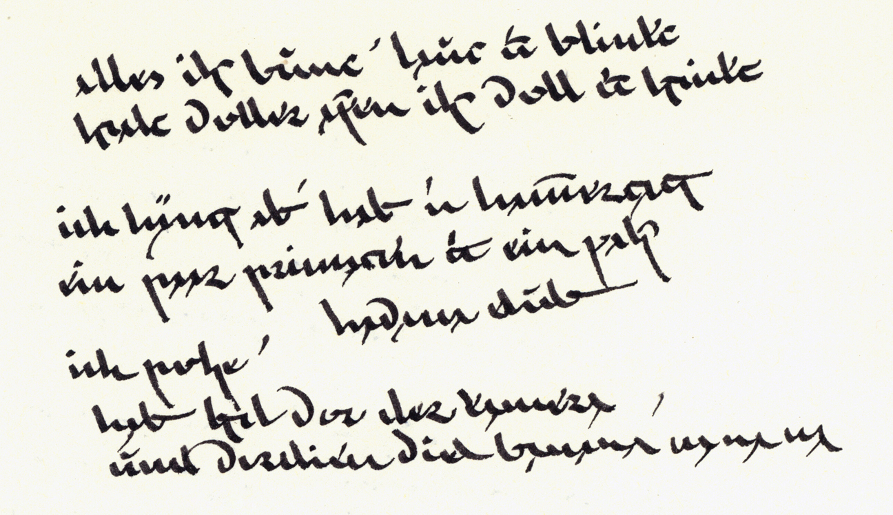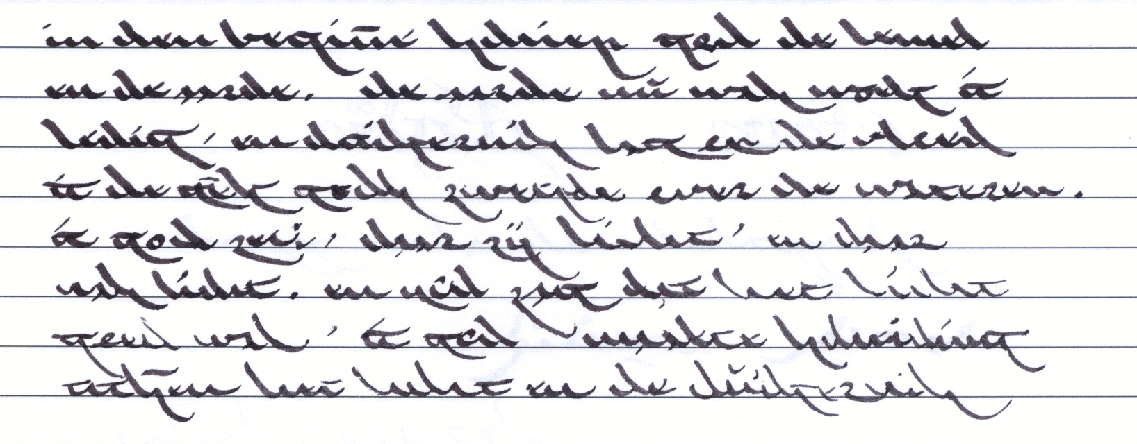 van naar rechts en de meeste letters een liggend boogje als basis hebben. Verder zitten er elementen in van de deutsche Kurrent, een mespuntje insulaire halfunciaal en nog zo her en der wat paleografische invloeden; een beetje hoe ons ons alfabet er in een alternatief universum ook uit had kunnen zien, als Karel de Grote in de 9e eeuw niet (maar gelukkig maar van wel) zijn beroemde minuskel had doorgevoerd.