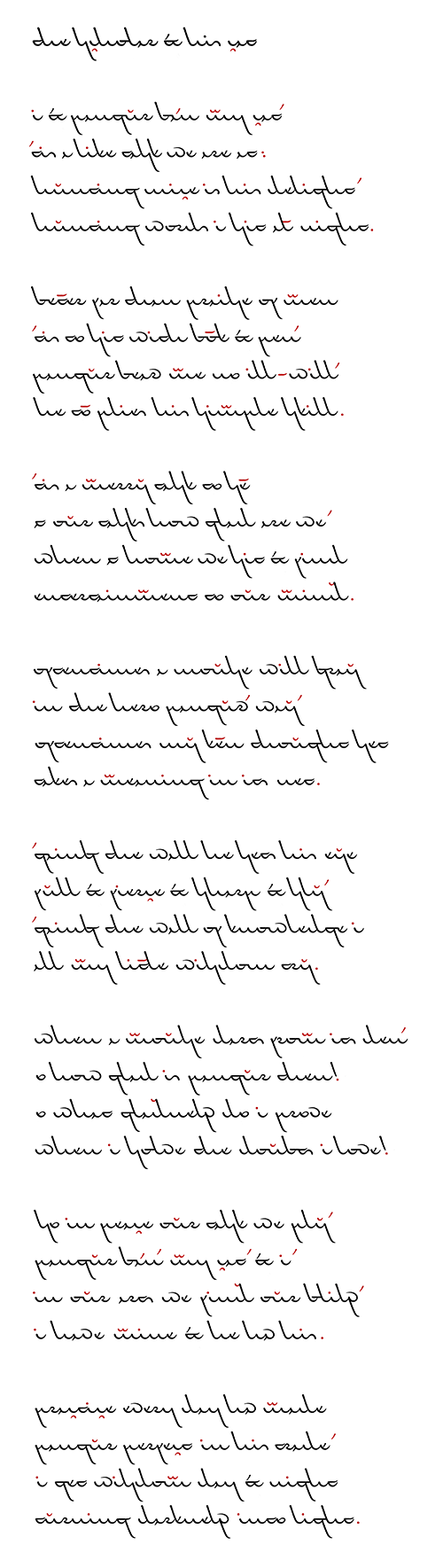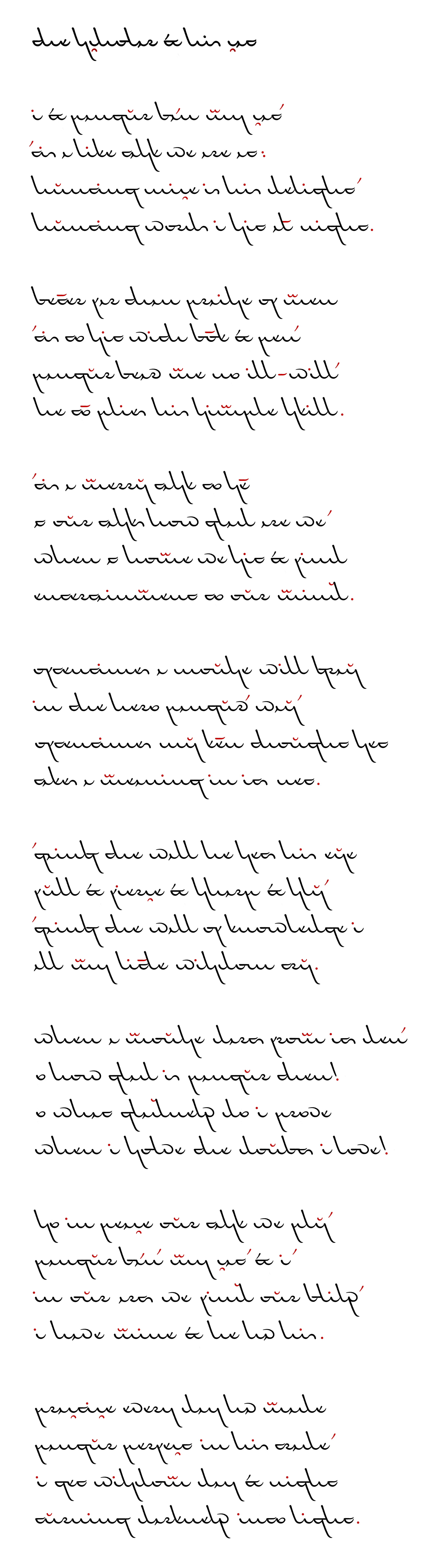 Voorlopig zijn er alleen kleine letters; voor hoofdletters overweeg ik gewoon een al bestaande schriftsoort in te zetten, zoals de unciaal. De letters zijn als volgt: