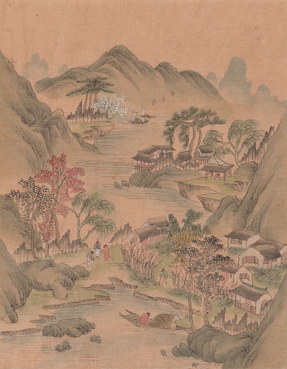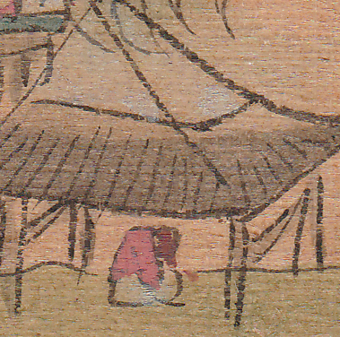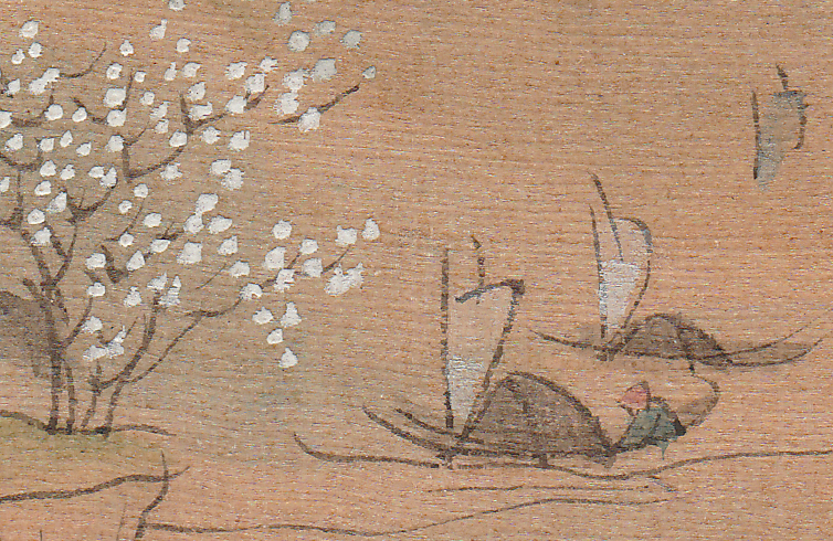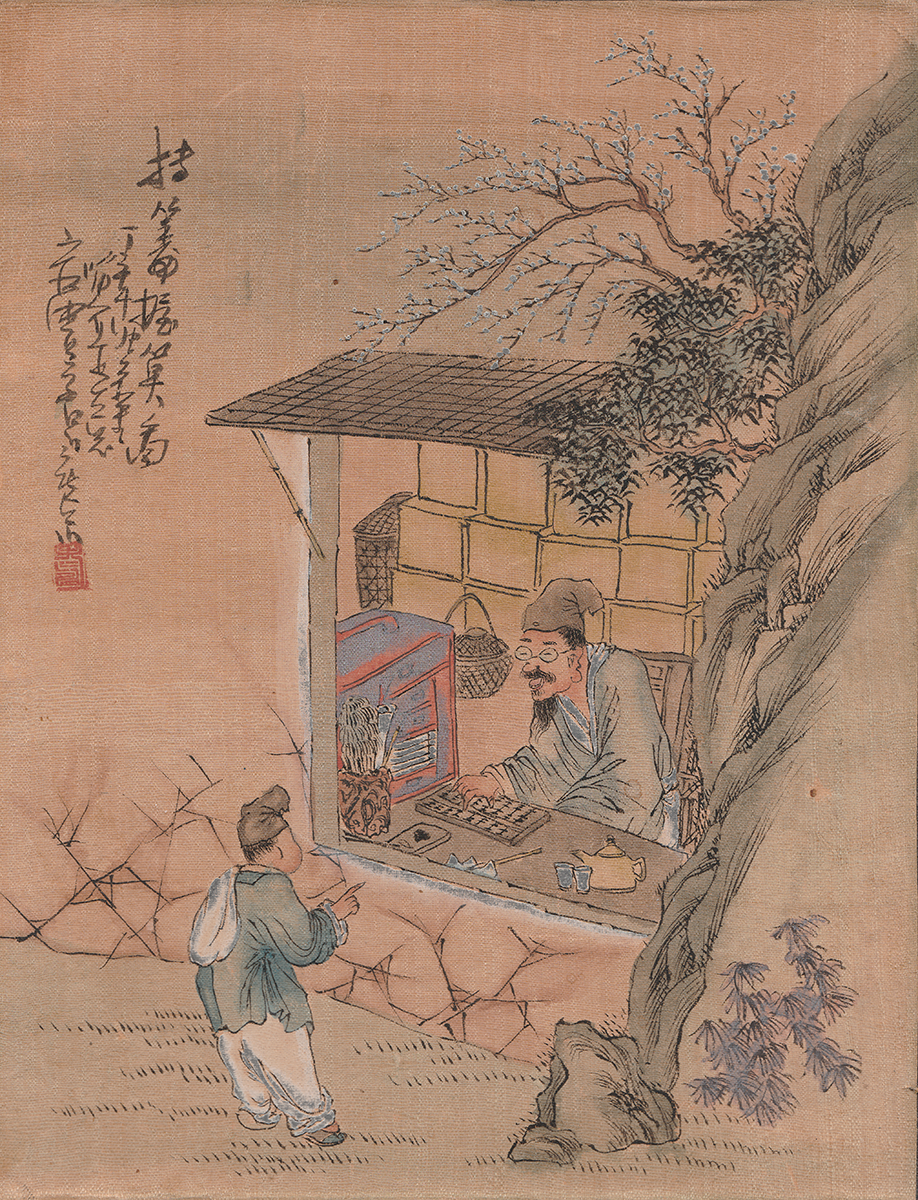 Jeps, de meningen lijken inderdaad de Chinese kant op te graviteren. Dat van dat verdoeken zou kunnen: het winkeltafereeltje zit op wat dikker karton geplakt dan het landschap. Maar misschien werd het papier sowieso op die manier geprepareerd; geen idee. Dank!