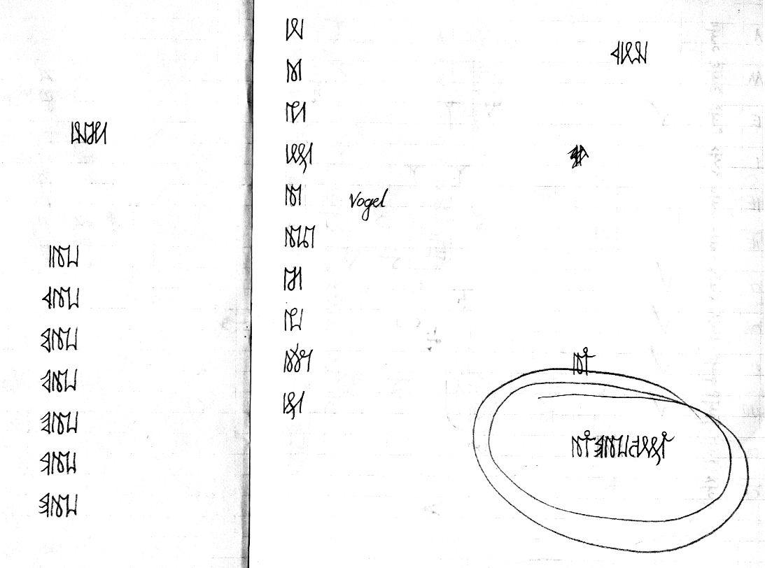 Zoals de frequentere frequenteerders onder u zullen weten mogen mijn gelederen zich in minstens één medeschriftverzinner verheugen, namelijk Victor “Frooi” Voermans. Lang geleden heb ik eens met hem gecommuniceerd over een lusachtig schrift waar ik halverwege de negentiger jaren een worp naar heb gedaan (zie plaatje hieronder) en later in de jaren tweeduizendnul geloof ik nog eens een halflaffe wederopvattingspoging op heb ondernomen, die echter mede door dingen als crashende schijven met hun handdoek in de ring zijn blijven hangen.