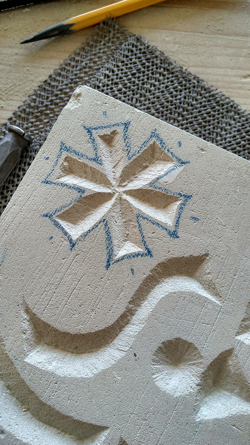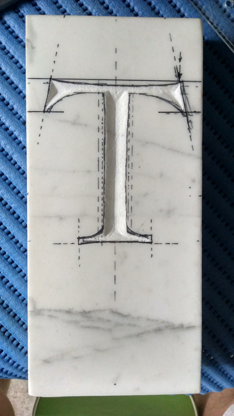 Welaan. Zo gezaaid, zo geoogst, en nu heb ik zelf een setje beitels in huis gehaald en me een bescheiden hakhoekje in het berghok gebouwd, bijgestaan door het prachtboek The Art of Letter Carving in Stone. Het knullige biksel van april begint langzaamaan op een letter te lijken, al is het duidelijk dat ik nog even een decenniumpje mag dooroefenen voor ik het net zo strak kan als de meester.