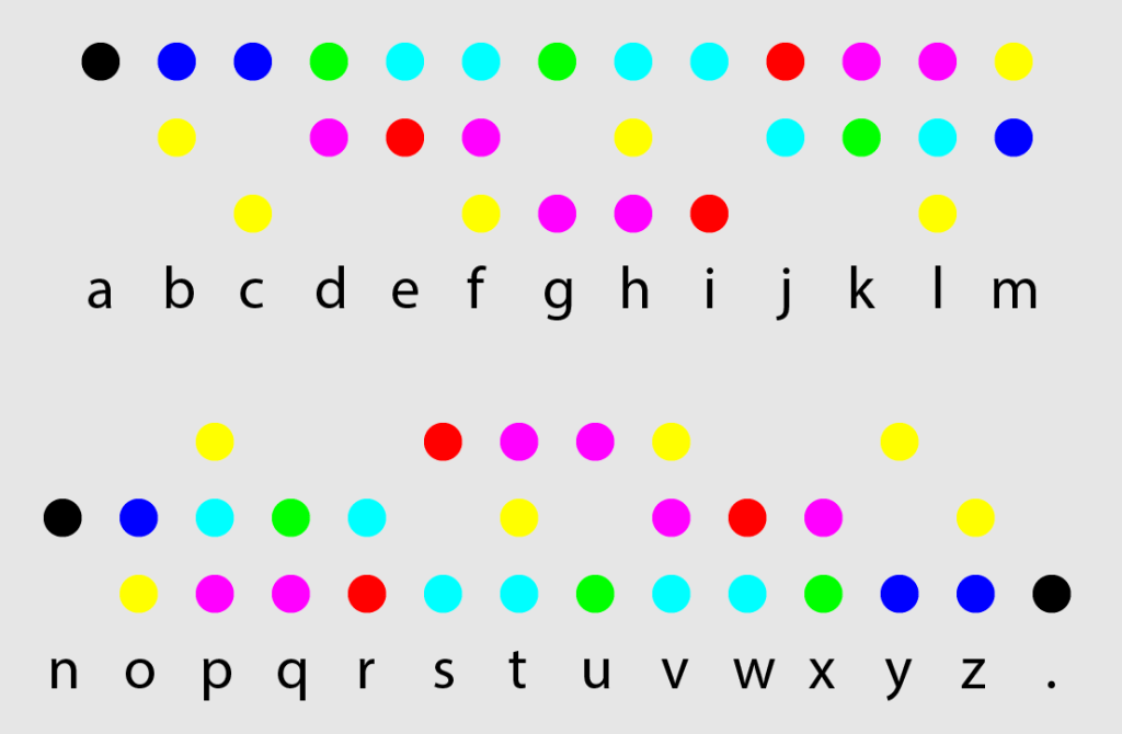 Elke letter van het alfabet bestaat uit een drietal stippen in CMYK-kleuren: cyaan, magenta en geel. Stippen kunnen ook overlappen, in welk geval ze elkaar subtractief opkleuren tot rood, groen, blauw en/of zwart: