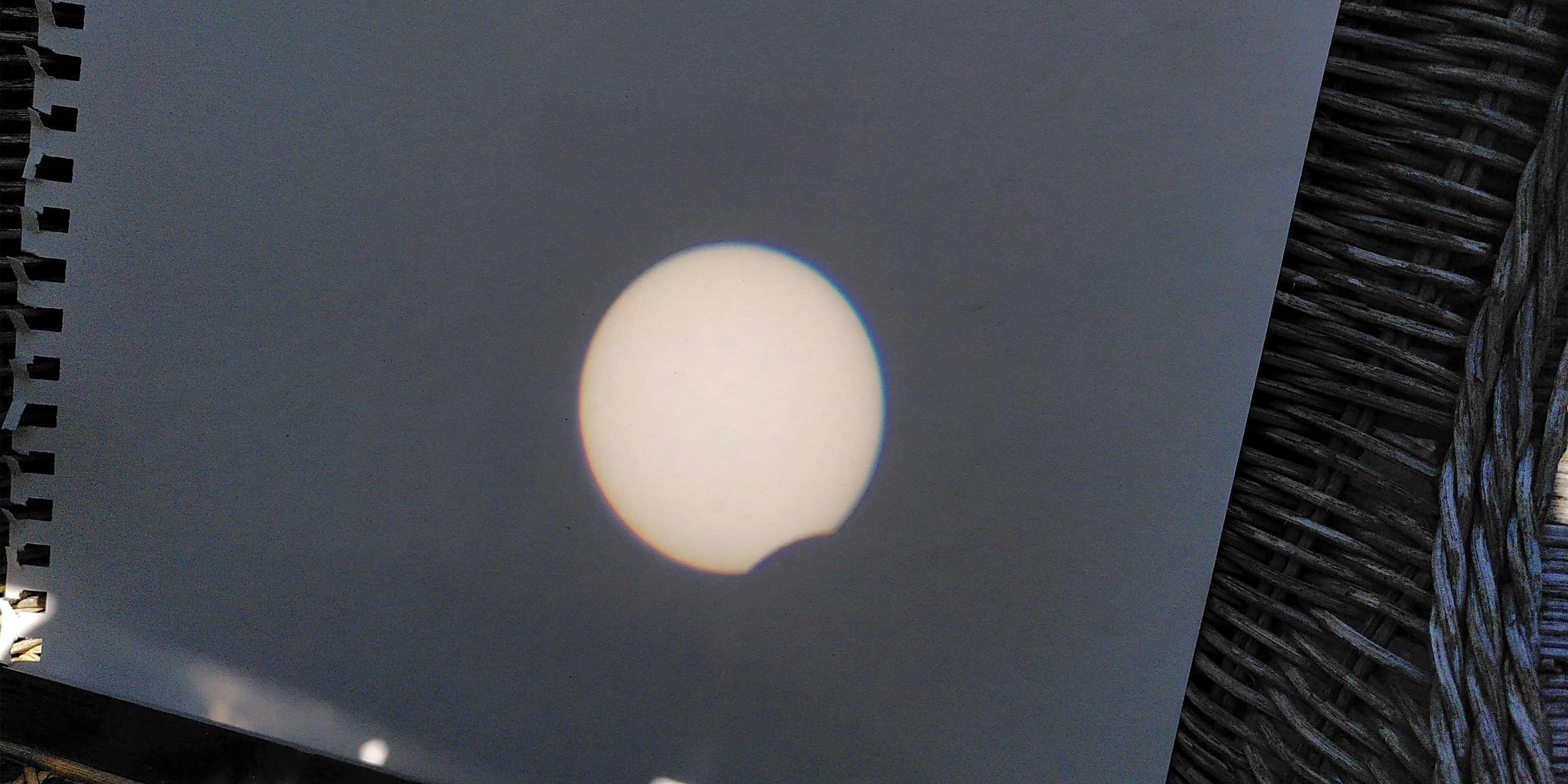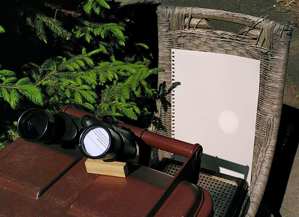 1. Benodigdheden: 1 zon, 1 maan, 1 verrekijker, 1 afvalcontainer, 1 kapotte rieten tuinstoel, 1 velletje papier, en ziedaar: een perfecte registratie van een niet zo zeldzaam natuurverschijnsel, waarvoor zich hier op Terschelling een hele menigte toeristen groepsgewijs had opgesteld met statieven en meterslange objectieven. De kosmologische en semi-wetenschappelijke pedanterie was niet van de lucht. Van verwondering en serene stilte die zo goed bij dit verschijnsel past, was geen enkele sprake. Vader heeft het verschijnsel in z’n achtertuin met één oog door een ouderwets zwart negatiefje gade geslagen. Het was weer prachtig.