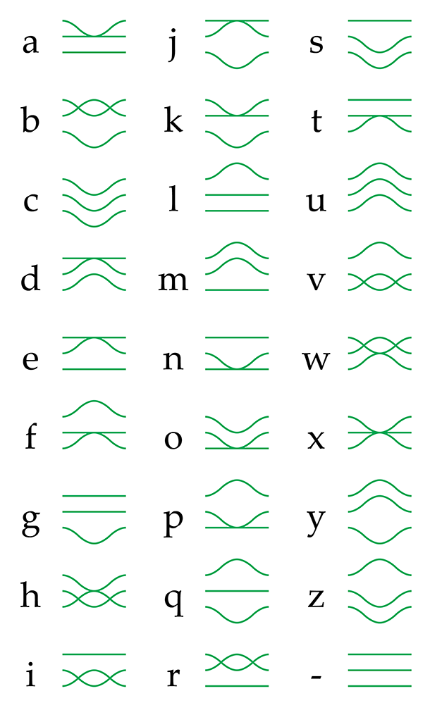 Het laatste teken (≡) wordt gebruikt als spatie/opvulling. Om letters te verdubbelen geef je ze een extra horizontale lijn (op een plek waar niet al een horizontale lijn zat):