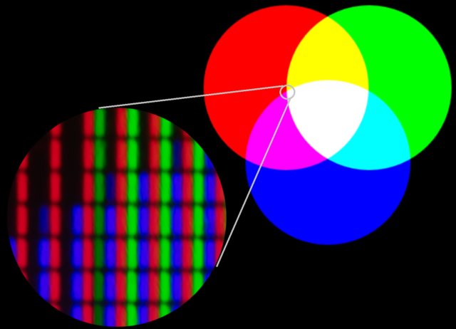 Het tweede antwoord is al een stuk maller. Hoe kun je nu wit krijgen als je kleuren mengt? Nou, door dingen te gebruiken die geen licht reflecteren (zoals verf) maar zelf lichtgeven. Zoals bijvoorbeeld uw monitor/telefoonscherm. Wie héél goed kan turen of een vergrootglas bij de hand haalt ziet dat elke pixel is opgedeeld in een rood, een groen en een blauw minilampje. Tuur nog harder en u ziet dat een geel vlak stiekem helemaal niet geel is, maar wordt gefabriceerd door alleen de groene en rode lampjes te laten branden en de blauwe uit te schakelen. Meng het blauw vervolgens weer terug bij het geel en je krijgt wit.