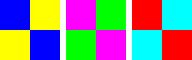 En de gein is dat dat niet alleen met geel en blauw werkt, maar met álle paren van complementaire kleuren. Zoals magenta+groen en rood+cyaan. Klik op het plaatje van de drie grijze vlakken bovenaan deze post om het te vergroten, en zie! De vlakken zijn helemaal niet grijs.