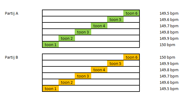 Het idee is supersimpel, het resultaat leuk verrassend en gevarieerd. En net effe anders dan Reich het doet/deed: in plaats van een vooropgezet vast melodietje als uitgangsblok te nemen, heb ik zes aparte tonen genomen, en die elk in hun eigen loopje gezet. Elk daarvan loopt op nét een fractie andere snelheid, waardoor de tonen met elkaar uit de pas gaan lopen. Het gevolg is dat het melodietje niet (zoals bij Reich) hetzelfde blijft, maar zelf geleidelijkaan van vorm verandert.
