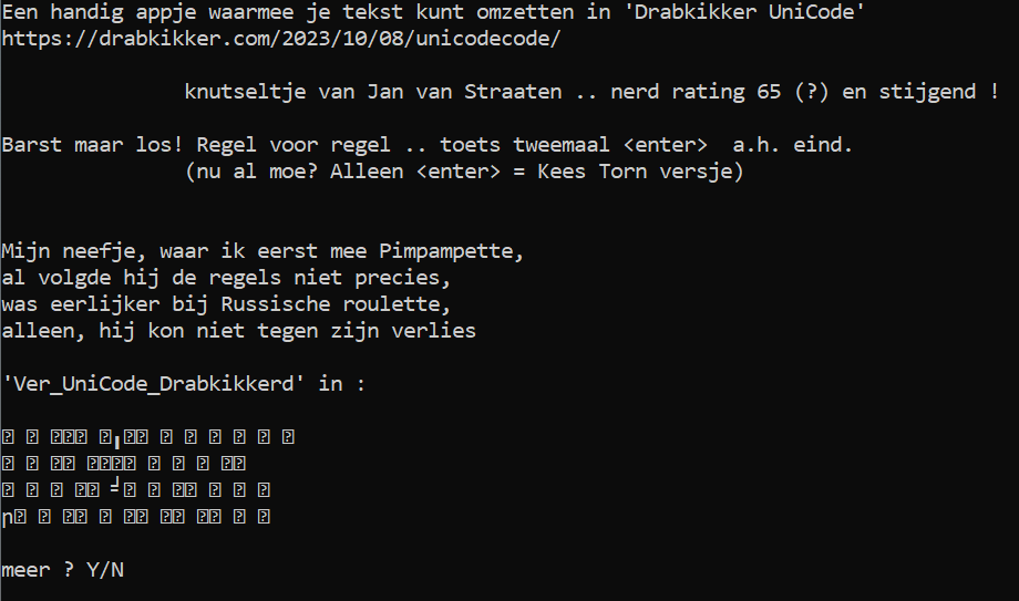 Ha! Het leek me al dat Unicodecode zich in principe vrij aardig naar een werkbaar computerapplicatietje zou kunnen laten coderen, alleen ben ik daar zelf niet voldoende bedreven in. En zowaar ziedaar: blogvolger Jan van Straaten maakt het gewoon even!