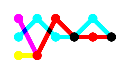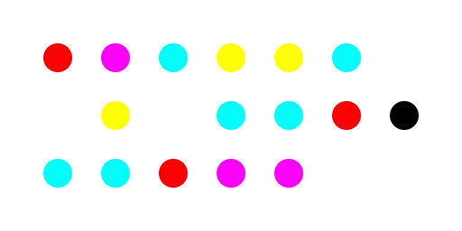 Hier liggen magenta en geel dus consistent over elkaar heen waardoor je rood krijgt.