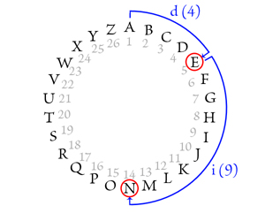 Die E nu vormt het uitgangspunt voor het coderen van de volgende letter, de i. Begonnen we daarnet te tellen bij de A; nu gaan we verder vanaf de E. Ditmaal moeten we de afstand afleggen die bij de i hoort, en aangezien de i de negende letter van het alfabet is (zie weer de grijze cijfers) leggen we deze keer een afstand van negen letters af. Komen we uit bij de N, en, precies, dat is dus onze tweede gecodeerde letter: