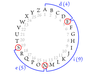 Voilà. Dat is nu mijn nieuwe code. Ziet u dat het eigenlijk wel meevalt, qua ingewikkeld? Bijna suf te noemen, zou men haast mompelen. Wat is hier precies de lol aan, en waarom zeg je niet gewoon metéén dat de d een E wordt, de i een N, etcetera, zonder dat hele gedoe met die cirkel? Nou, omdat de d helemaal niet altijd een E wordt, noch de i altijd een N, etcetera.