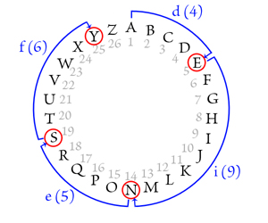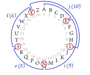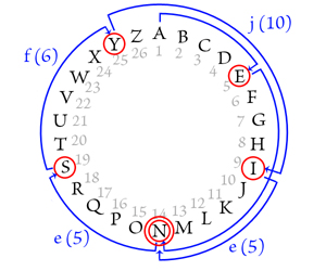 Kijk bijvoorbeeld maar eens wat er gebeurt als we ons woord willen verlengen tot, bijvoorbeeld, diefje. We waren bij de Y gebleven, dus dat wordt weer de uitgangsletter voor de j. De j is de tiende letter van het alfabet, en dus gaan we vanaf de Y tien letters naar rechts. We zijn inmiddels de cirkel rond, maar dat geeft helemaal niets, we tellen gewoon tien letters met de klok mee, en aldus komen we op de I: