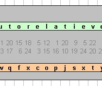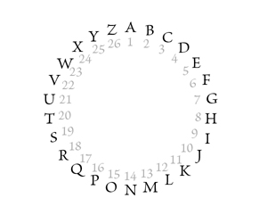 Zozuziet lopen de 26 letters in hun gebruikelijke volgorde van A tot Z in een rechtsomme cirkel, en na de Z komt weer de A. De grijze cijfers staan voor de posities van de desbetreffende letters in het alfabet: A = 1; P = 16, etc. Dat is handig voor zometeen.