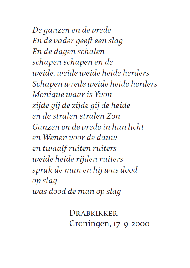 Weer eens een oudje uit Drabkikkers doos van voor de Twin Towers: een gedicht dat als gevolg van C2H5OH-houdende oplossingen in combinatie met een schrijfsel van Blinde Schildpad min of meer spontaan tot me kwam. Vraag mij dus ook niet waar het over gaat.