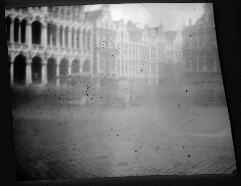 Ruim twee jaar geleden (hora ruit en tempus speelt den fluit) ging ik een lang meiweekend naar Brussel, en kwam ik op het idee om voor die gelegenheid een cameraatje obscura te bouwen: een kartonnen visitekaartjesdoosje, lichtdicht gemaakt met zwarte verf en tape, aan de voorzijde een uitsparing met een stukje colablik, met daarin een minuscuul speldeprikje. Pinhole-camera, noemt men zoiets daarom ook wel. Aan de achterwand plak je dan een stukje lichtgevoelig materiaal (ik had nog fotopapier liggen, maar je kunt ook stukjes van een filmrolletje knippen – als je het uiteraard maar in het donker doet), en vervolgens richt je het apparaat op iets genieks dat niet teveel beweegt, want vanwege het kleine gaatje duurt het maken van een foto minstens een paar minuten.