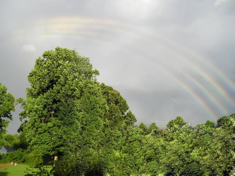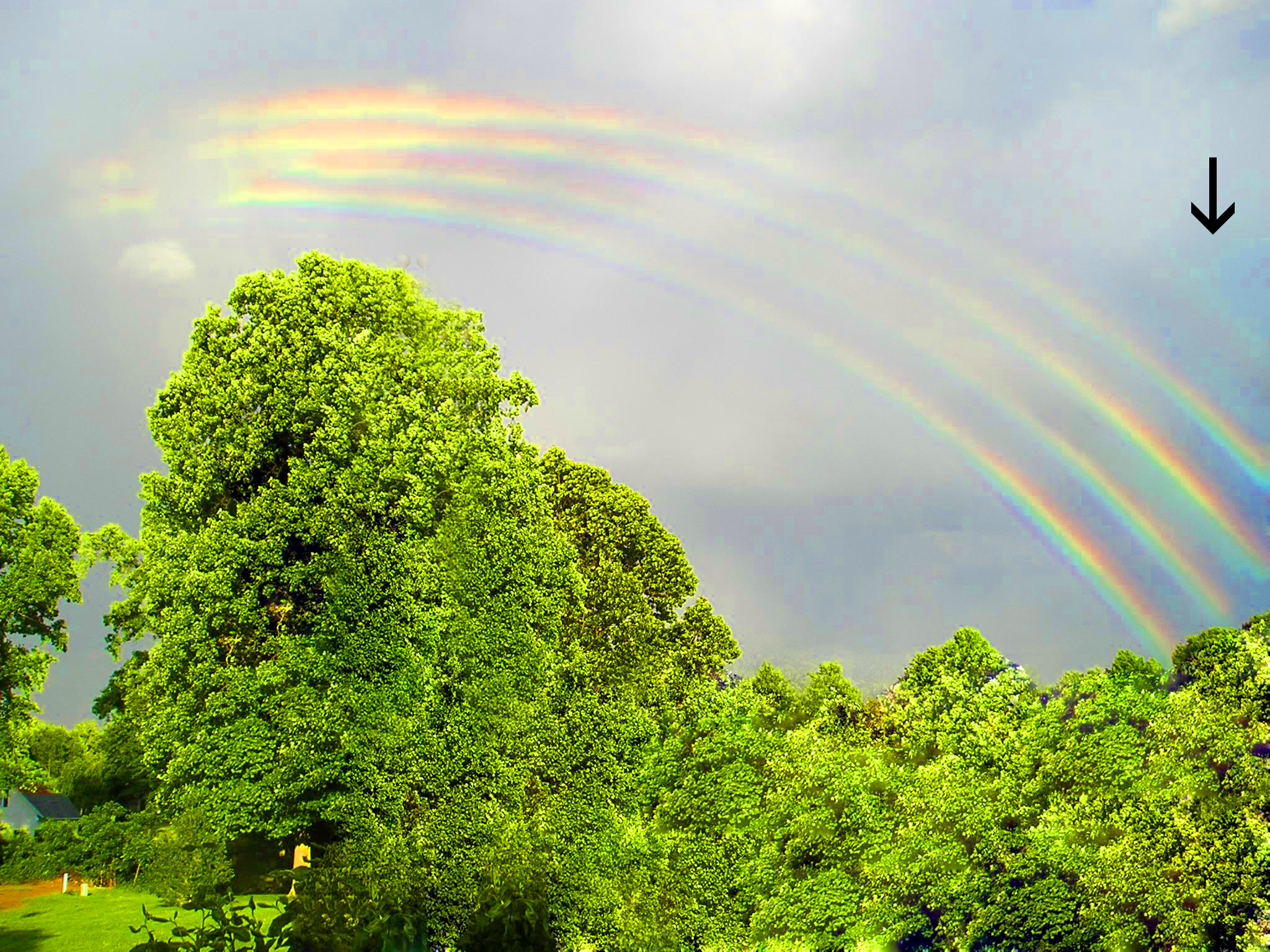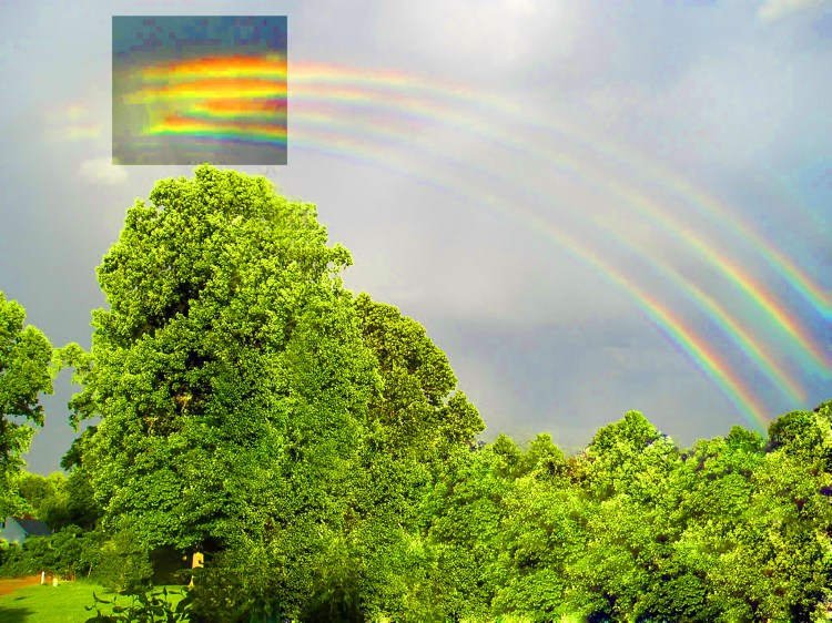 Ik herhaal mijn punt: àls er aan het plaatje is geknoeid, dan in ieder geval met vaardigheid. Een regenboog is doorzichtig, dus als je daarmee aan het knippen en plakken slaat neem je de achtergrond (de wolken) mee, wat opvalt als je het niet zorgvuldig maskeert. Dit probleem is te ondervangen door een aparte afbeelding te gebruiken van een regenboog met egale hemel erachter, en die als halfdoorzichtige layer over een doel-afbeelding heen te plaatsen. Maar als dat is wat de maker heeft gedaan, dan is hij er zich in ieder geval bewust van geweest dat de richting van het zonlicht in die doelafbeelding direct van achteren moest komen zoals dat hoort bij regenbogen, want zoals u aan de bomen kunt zien is dit inderdaad het geval. Voorts kan men zich afvragen waarom hij de vier bogen zo rommelig ten opzichte van elkaar heeft geplaatst en niet netjes op gelijke afstand zoals bij een echte dubbele regenboog, wat veel geloofwaardiger was geweest, en daardoor dus juist minder geloofwaardig, als u me vat.