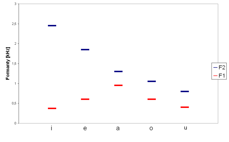 Het wonderlijke nu is dat slechts twee of drie formanten al voldoende zijn voor een min of meer realistisch effect. De klinker e bijvoorbeeld kan men weergeven met een combinatie van slechts twee toonhoogtes: eentje van ongeveer 600 Hz en eentje van ongeveer 1900 Hz: zie het plaatje hierboven. Combineer beide frequenties in een geluidsprogramma naar keuze (de derde formant er ook nog bij doen maakt het helemaal mooi), en u hoort een e; echt waar.
