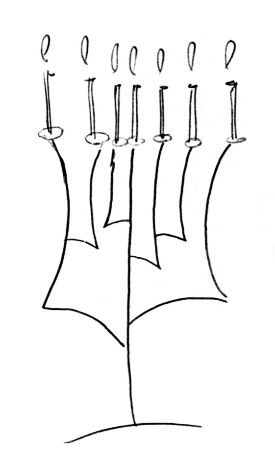 Nauwelijks herkenbaar als dezelfde letter dus, maar als u goed kijkt ziet u dat alle zeven versies dezelfde configuratie van splitsingen hebben: een ‘linksaf+rechtdoor’-splitsing onderaan, een ‘rechtdoor+rechtsaf’ aan de linker tak daarvan en een ‘linksaf+rechtsaf’ aan de rechter. (De meest rechtse variant is visueel zo afwijkend dat ik ‘m onder de subnaam Haaks Boom heb opgenomen.)