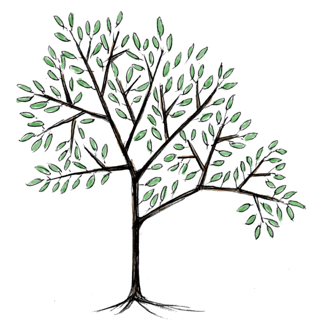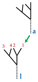 Dus als we nu bijvoorbeeld na de l een a willen toevoegen, dan komt die aan takje nummer 1. Belangrijk is dat de stippellijn van elk nieuw letterboompje samen komt te vallen met de tak waaraan het gekoppeld wordt, wat betekent dat het boompje ‘meedraait’ met de hoek die die tak toevallig maakt: