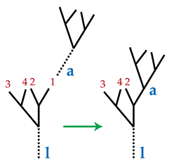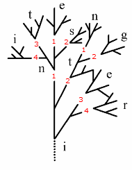 Het koppelen van het ene letterboompje aan het andere gebeurt volgens een vastgelegde volgorde: dit is waar de rode cijfers bij de letterboompjes op slaan in de alfabettabel hierboven. Elk van de vier takken van ieder boompje is genummerd van 1 t/m 4, wat aangeeft in welke volgorde nieuwe letters aan dat boompje moeten worden gekoppeld.