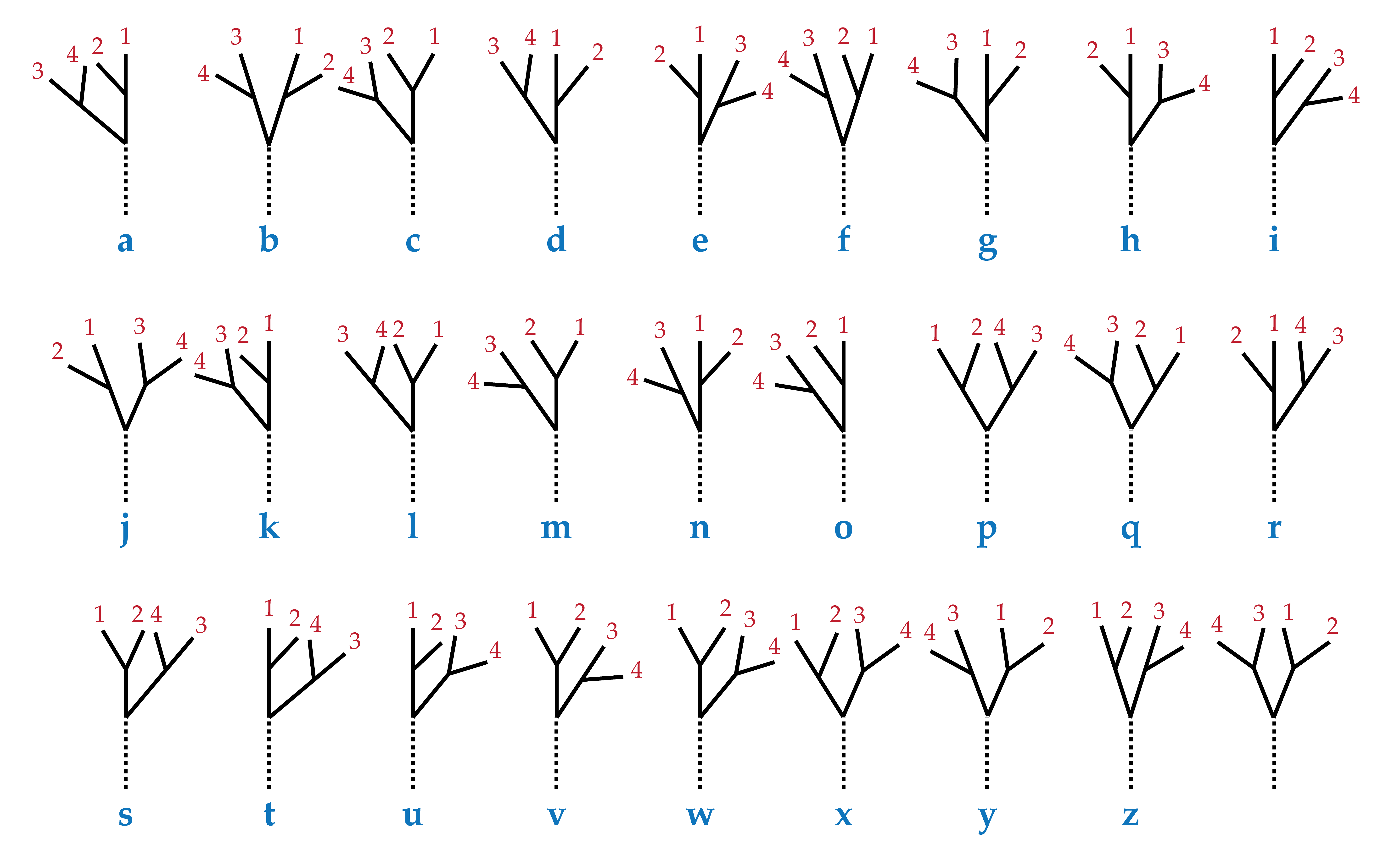 Elke letter van het alfabet wordt vertegenwoordigd door een mini-boompje dat is opgebouwd uit een combinatie van drie taksplitsingen. Er zijn drie soorten splitsingen: a) linksaf+rechtdoor; b) rechtdoor+rechtsaf en c) linksaf+rechtsaf: