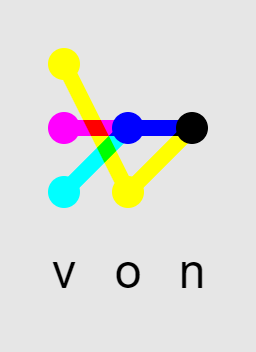 - Trek lijnen van de stippen van letter 1 naar die van letter 2, zodanig dat je cyaan verbindt met cyaan, magenta met magenta en geel met geel. Als een of meerdere van je stippen blauw, groen, rood of zwart is, moet je weten wat de onderliggende cyaan-/magenta-/geel-bestanddelen van die stippen zijn om de juiste lijnen te trekken. In dit voorbeeld hebben we een o met een blauwe stip, die (even spieken in het recept hierboven) uit de kleuren cyaan + magenta bestaat. Dat betekent dat zowel de magenta- als de cyaan-lijn vanaf de v naar de blauwe stip van de o moeten lopen. De gele stippen in beide letters zijn onvermengd, dus geel loopt gewoon naar geel: