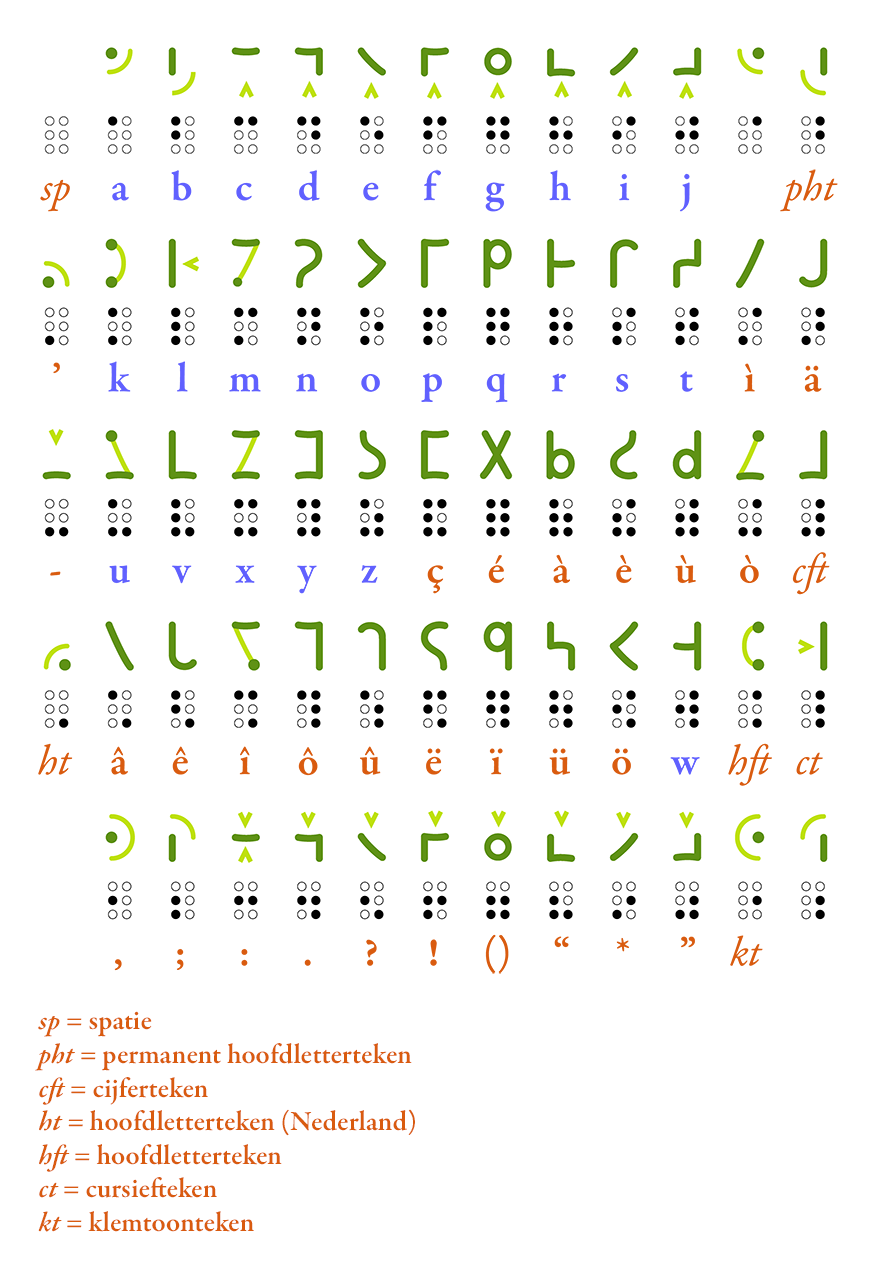 In echt Braille zijn de ruimtes tussen letters essentieel voor hun betekenis, in cursief niet direct, dus alles mag wat compacter tegen elkaar aan geschoven. Voorbeeldtekstje:
