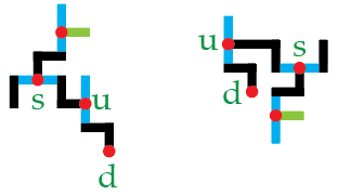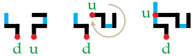 Aan welke zijde van het koppelsegment je een nieuwe letter plaatst is vrij naar keuze. Dus de u mag ook aan de linkerkant van het koppelsegment van de d worden geplaatst – en moet in dat geval 90° naar links worden geroteerd: