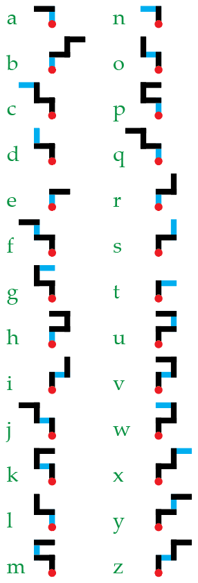 Elke letter is een vormpje opgebouwd uit een aantal lijnstukken met haakse hoeken daartussen; om mededelingen te schrijven worden die vormpjes op een voorgeschreven manier aan elkaar gekoppeld. Daarbij heeft de schrijver een ruime keur aan keuzevrijheid, waardoor één en dezelfde boodschap talloze verschillende eindresultaten kan opleveren.