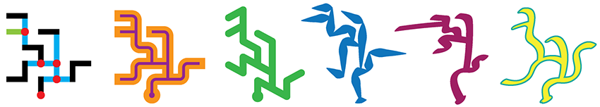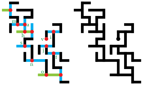 Is je boodschap uiteindelijk klaar, dan laat je de kleurmarkeringen van de oorsprongspunten en koppelsegmenten verder weg – met uitzondering van het oorsprongspunt van de allereerste letter, anders weet je niet meer waar je moet beginnen met lezen:
