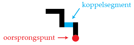 Het rode bolletje onderaan iedere lettervorm markeert het ‘oorsprongspunt’ van die letter; de blauwe lijnstukken geven aan waar de eerstvolgende letter moet worden aangekoppeld: ik noem dit het ‘koppelsegment’: