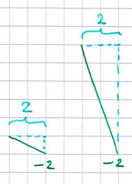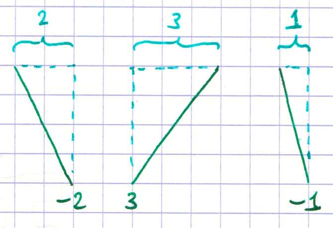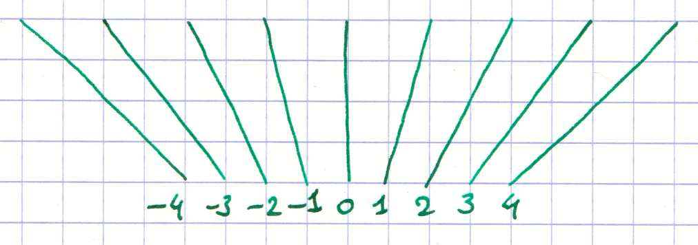 De lijnen worden onderscheiden naar hun ‘schuinte’, wat neerkomt op: hoeveel ruitjes moet ik naar links of naar rechts om van het onderste uiteinde van de lijn bij zijn bovenste uiteinde te komen? Naar links geeft een negatief getal, naar rechts een positief getal. Dit zijn bijvoorbeeld lijnen van schuintes -2, 3 en -1: