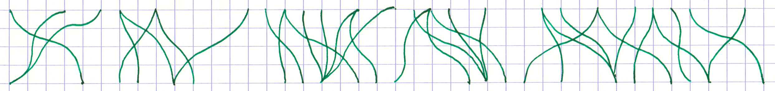 Hoe twee kruisende lijnen precies ten opzichte van elkaar staan is globaal vrij naar keuze, zolang hun schuintes maar kloppen en zolang ze maar kruisen. Als gevolg daarvan kan eenzelfde letter verschillende gedaanten aannemen, met de kruising op uiteenlopende hoogten. De n is bijvoorbeeld een kruising tussen een 3 en een -4 en kan er o.a. op de volgende manieren uitzien: