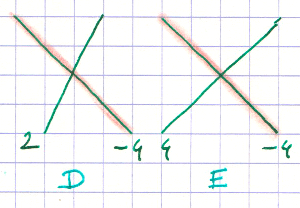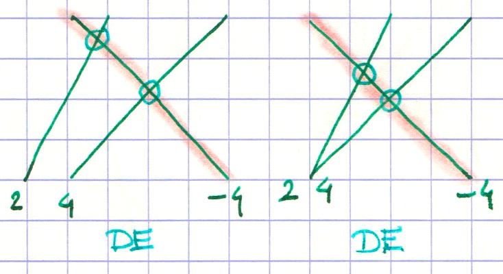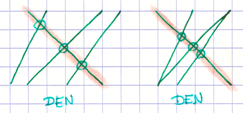 Maar omdat beide letters een lijn van gelijke schuinte (-4) bevatten, mag de combinatie worden hergetekend zodanig dat de overgebleven lijn van de d (2) en die van de e (4) allebei door de -4 lopen. Bijvoorbeeld op deze twee manieren: