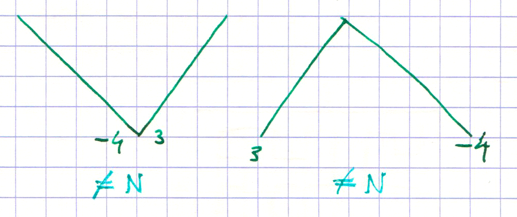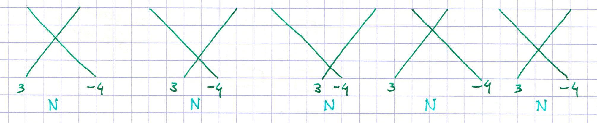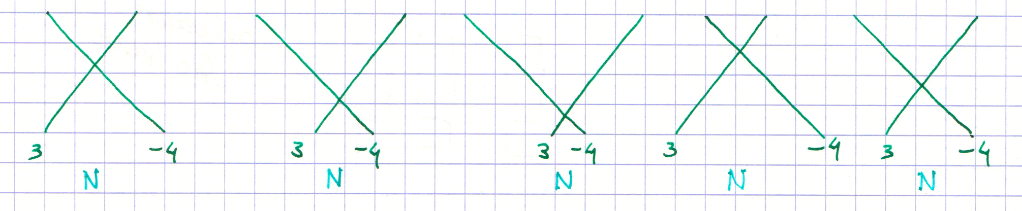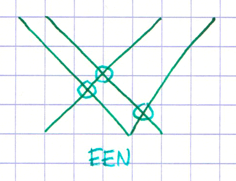 Om een letter te vormen moeten de lijnen echt een X met elkaar maken; lijnen die elkaar alleen maar met de punt raken tellen niet als kruisend. Dus dit zijn geen n‘nen: