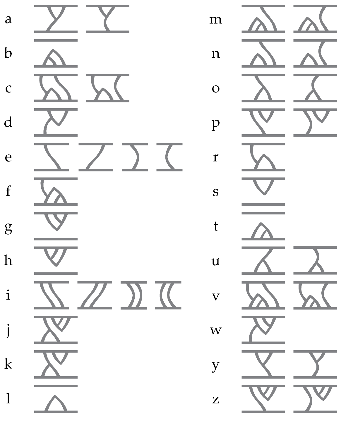 Zoals het alfabet laat zien, hebben veel van de letters een aantal mogelijke varianten. Die zitten hem er voornamelijk in dat de “hellingen” van de a, c, e, i, m, n, o, p, u, v, y en z ook de vorm van een “bocht” mogen krijgen. De e en de i hebben daarnaast ook nog vrij spel qua welke richting de helling of bocht op mag lopen.