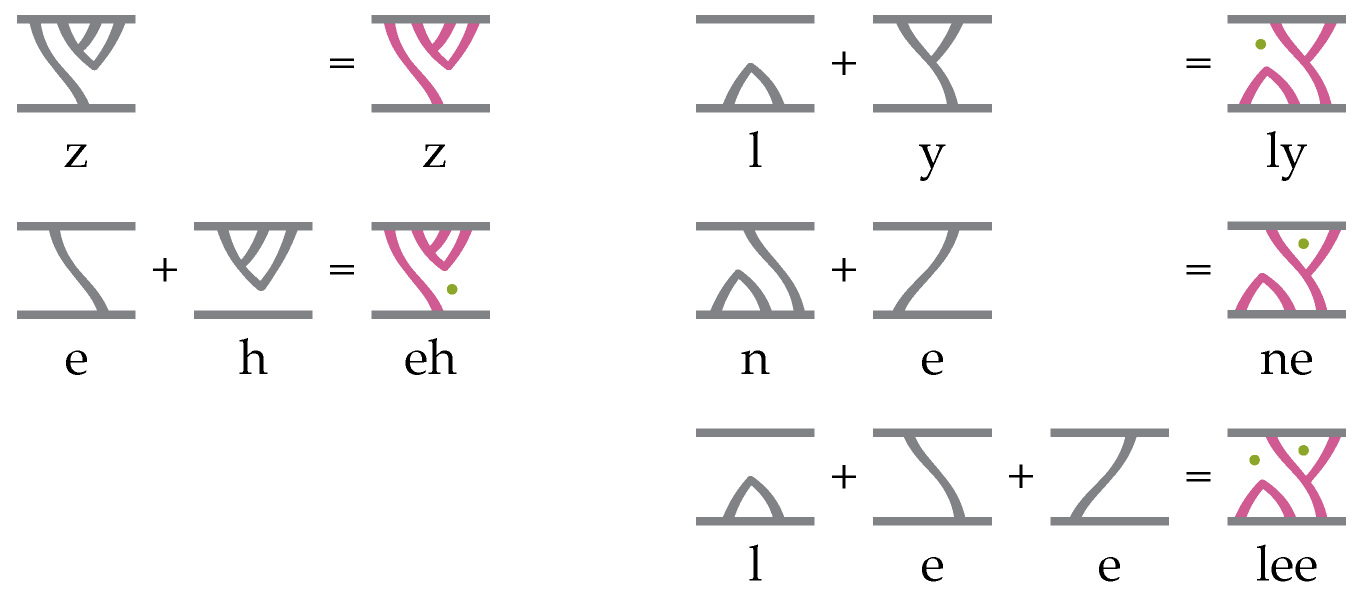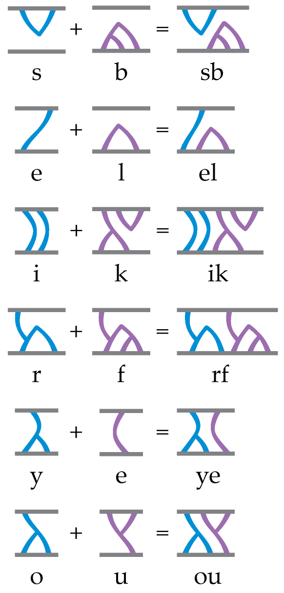 Bij het schrijven worden letters van links naar rechts naast elkaar geplaatst. Bij sommige combinaties gebeurt er dan verder niets bijzonders met de lettervormen. Bijvoorbeeld (de kleurtjes zijn ter onderscheiding van de afzonderlijke letters):