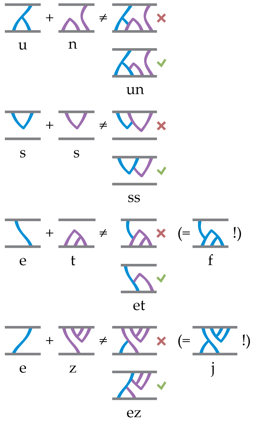 - Een combinatie van letters mag geen verwarring opleveren met andere (combinaties van) letters. Daarover meer in het hierondere.