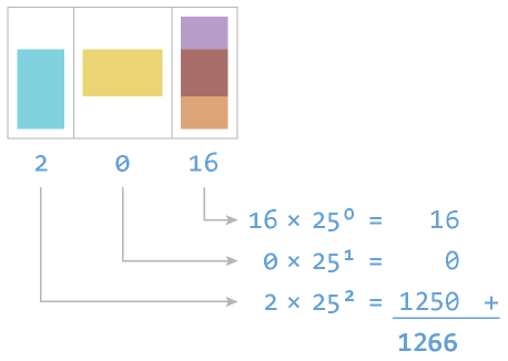 Getallen boven de 24 geef je weer door meerdere cijfertekens op een rij te plaatsen. Dat werkt positioneel, net als in ons tientallig stelsel: hoe verder naar links in de rij, des te hoger de waarde is die door één en hetzelfde cijfer wordt uitgedrukt. Alleen dan niet met machten van 10 maar van 25.