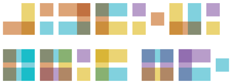 Die secundair ontstaande kleuren betekenen verder hemmeneks, maar leveren vrolijke visuele variatie op. Ik heb expres een reepje wit tussen de balkjes gelaten zodat je altijd nog een stukje van de ongemengde kleuren blijft zien (ik had eerst een versie die dat niet deed, maar dat vond ik zielig voor mijn lezers).