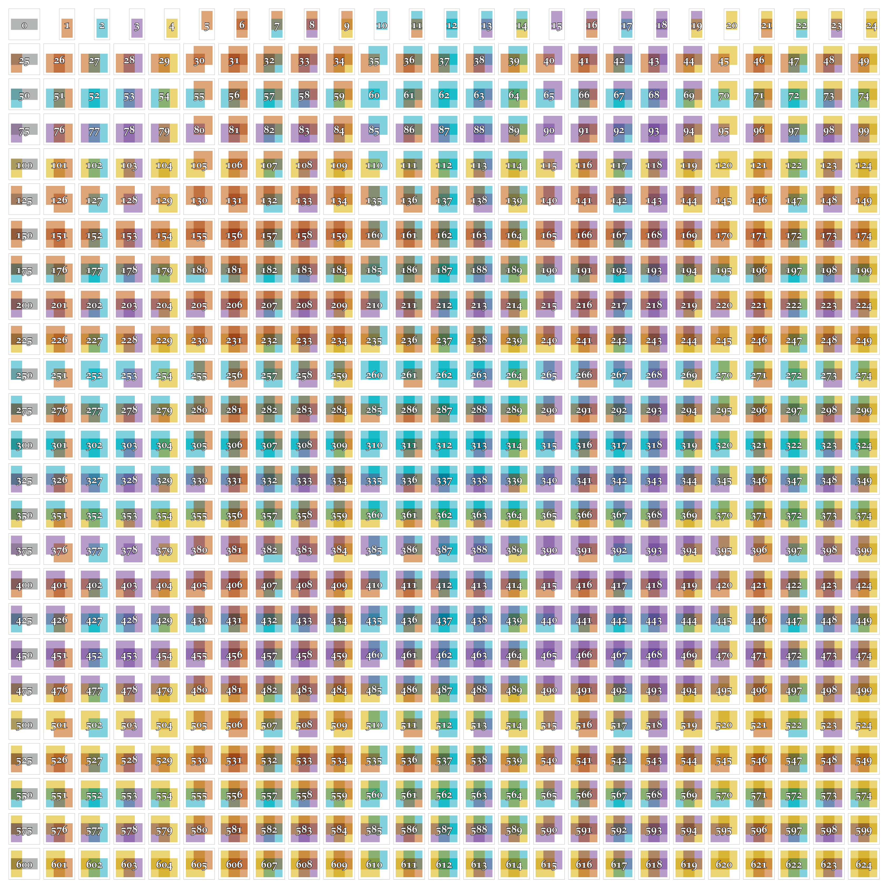 Zo’n vijfentwintigtallig getalsysteem is al fijn breinkraken, maar desgewenst is het nog nader uitbreidbaar tot een zeshonderdvijfentwintigtallig systeem. Namelijk door de kleuren van naburige cijferparen met elkaar te laten overlappen en de boel te herschikken binnen een vierkant:
