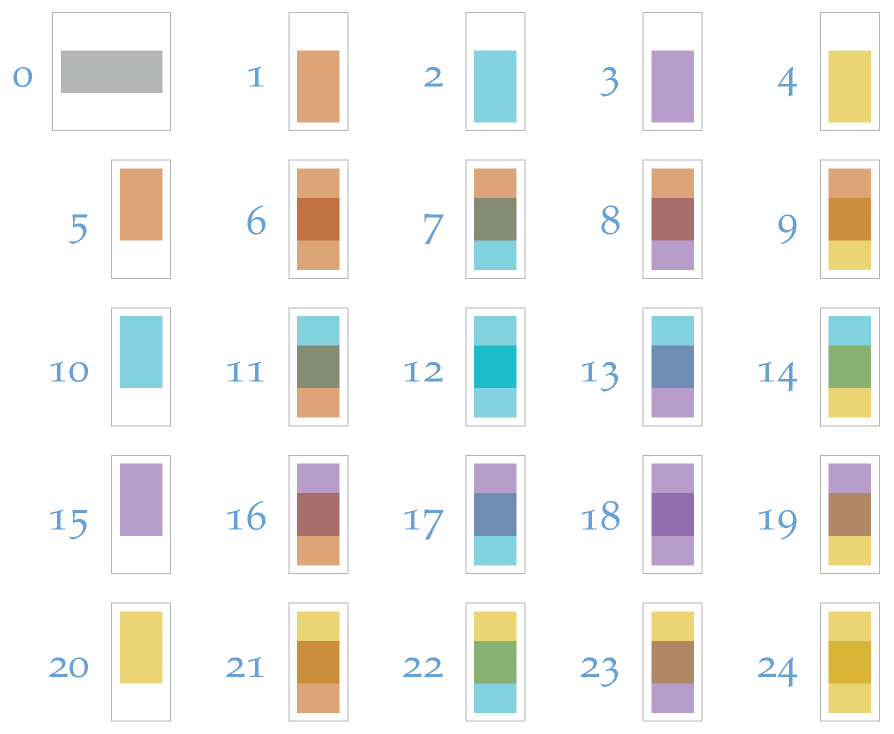 Op deze manier zijn met de vijf basiskleuren 5 × 5 = 25 combinaties te bouwen, wat dit een vijfentwintigtallig getallenstelsel maakt. Net als dat van het D’ni bijvoorbeeld.